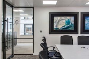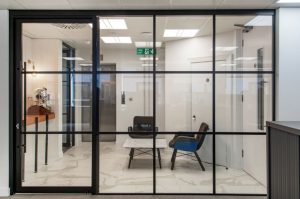 Fusion partitions were asked to supply a functional banded sliding door system that not only achieved the desired asthetic, but also acheived the required acoustic rating. The Contempo Glide banded single glazed sliding door at 36dB Rw was the clear choice, this was used along side our pivoted Contempo banded doors at 40dB Rw to provide the customer with an environoment that not only looks great but performs acoustically too.