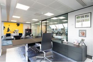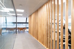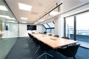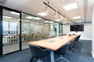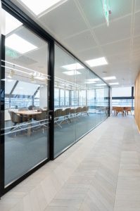 The end user was very keen to keep noise contamination down to a minimum but also wanted as much natural light to permeate through office as possible. Our Clearline 100 double glazed system certified to 54dB Rw was the perfect solution, especially when combined with our Contempo double glazed acoustic door certified to 46dB Rw